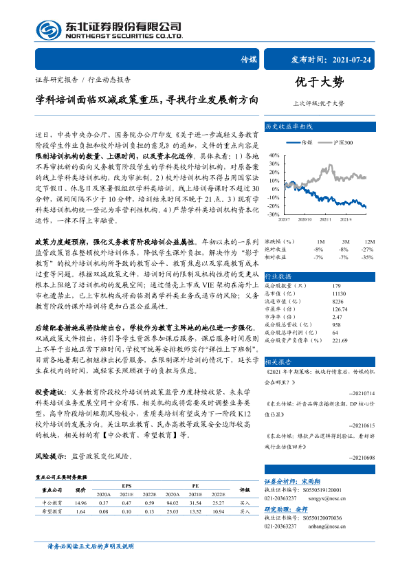 【东北证券】【20210724】20210724-东北证券-传媒行业动态报告:学科培训面临双减政策重压,寻找行业发展新方向-3页