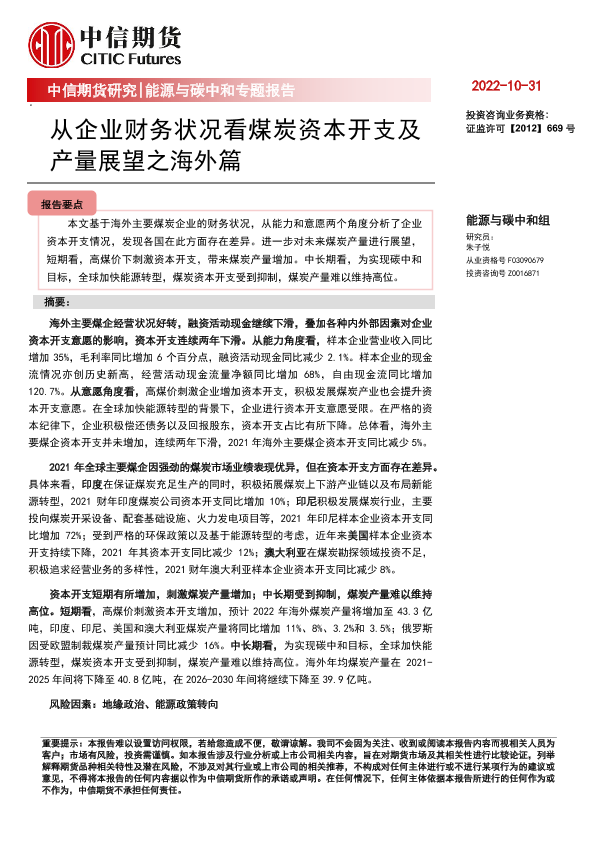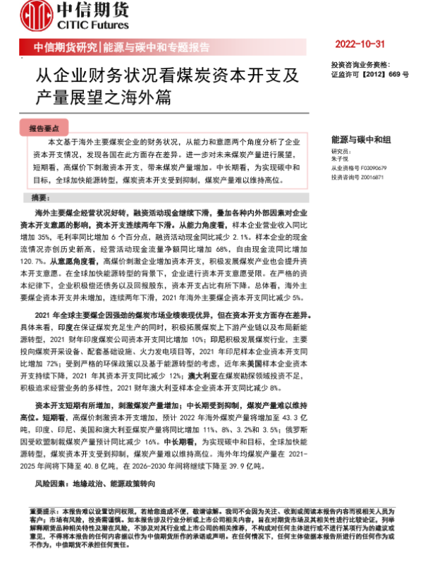 【中信期货】【20221031】能源与碳中和专题报告:从企业财务状况看煤炭资本开支及产量展望之海外篇-22页
