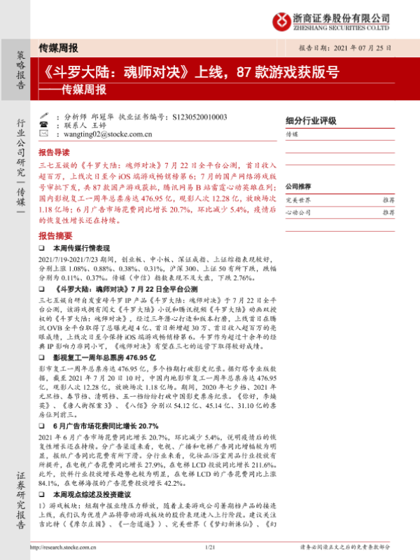 【浙商证券】【20210725】20210725-浙商证券-传媒周报:《斗罗大陆:魂师对决》上线,87款游戏获版号-21页