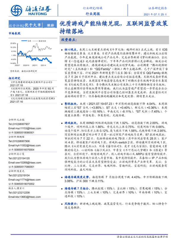【海通证券】【20210725】20210725-海通证券-传媒行业周报:优质游戏产能陆续兑现,互联网监管政策持续落地-13页