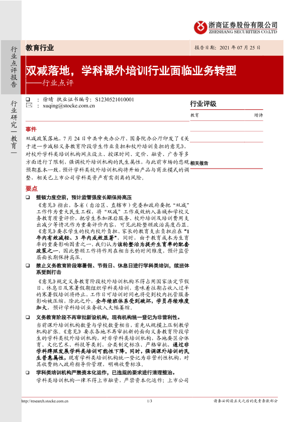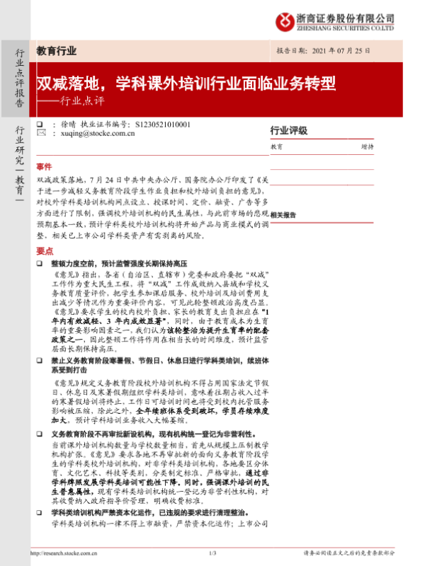 【浙商证券】【20210725】20210725-浙商证券-教育行业点评:双减落地,学科课外培训行业面临业务转型-3页