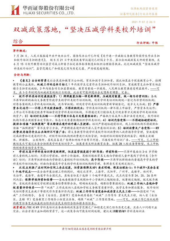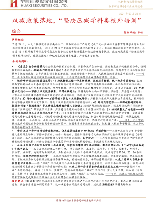 【华西证券】【20210726】双减政策落地,“坚决压减学科类校外培训”-4页