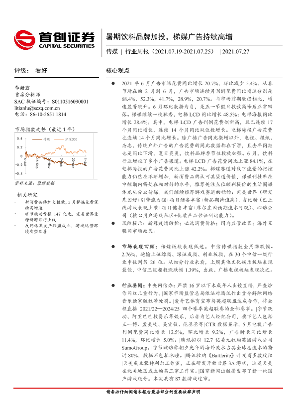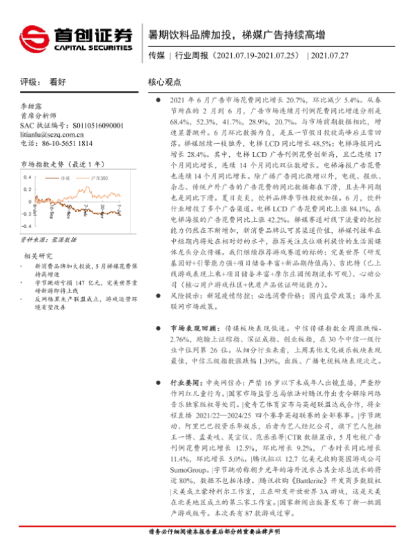 【首创证券】【20210727】20210727-首创证券-传媒行业周报:暑期饮料品牌加投,梯媒广告持续高增-11页