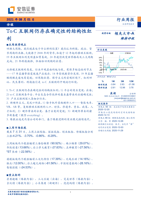 【安信证券】【20210801】20210801-安信证券-传媒行业周报:To C互联网仍存在确定性的结构性红利-13页