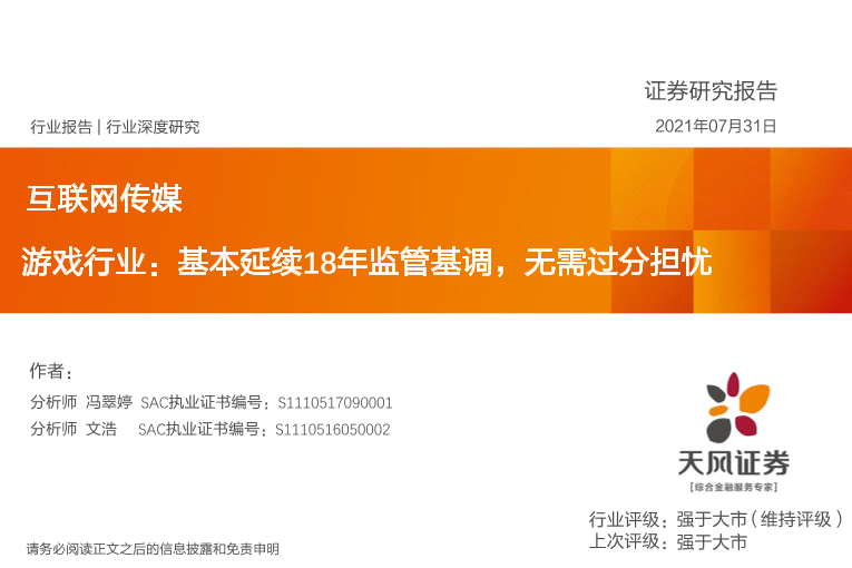 【天风证券】【20210731】20210731-天风证券-互联网传媒行业深度研究:游戏行业:基本延续18年监管基调,无需过分担忧-11页