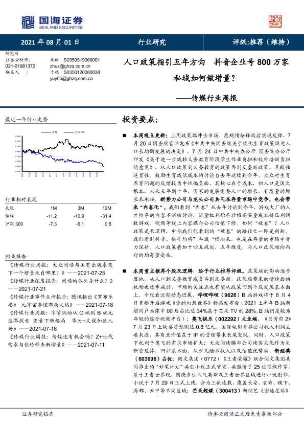 【国海证券】【20210801】传媒行业周报:人口政策指引五年方向抖音企业号800万家私域如何做增量?-19页