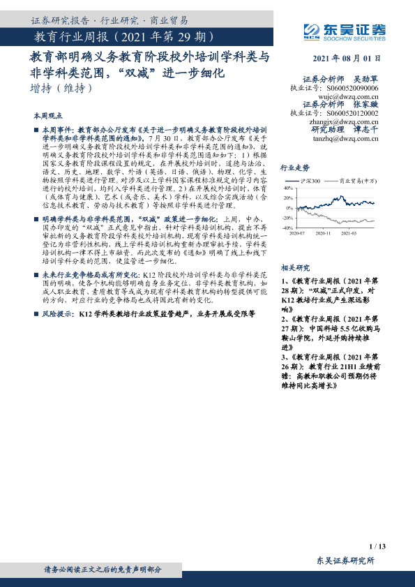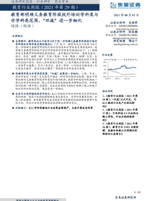 【东吴证券】【20210801】教育行业周报(2021年第29期):教育部明确义务教育阶段校外培训学科类与非学科类范围,“双减”进一步细化-13页