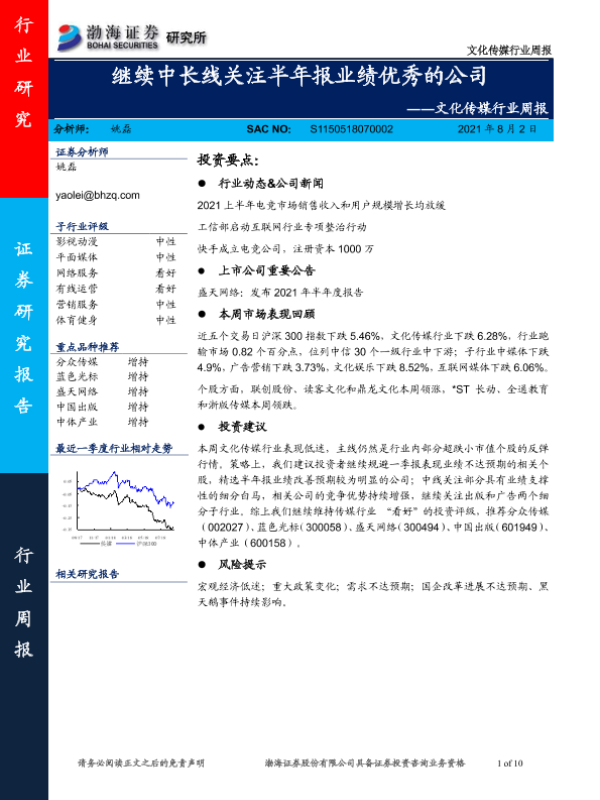 【渤海证券】【20210802】文化传媒行业周报:继续中长线关注半年报业绩优秀的公司-10页