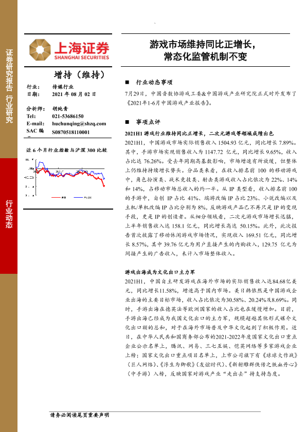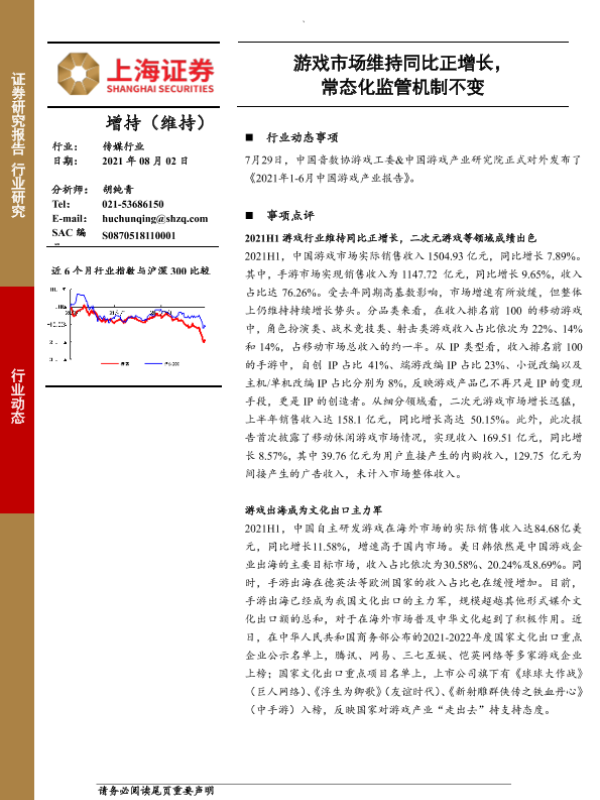 【上海证券】【20210802】20210802-上海证券-传媒行业:游戏市场维持同比正增长,常态化监管机制不变-3页