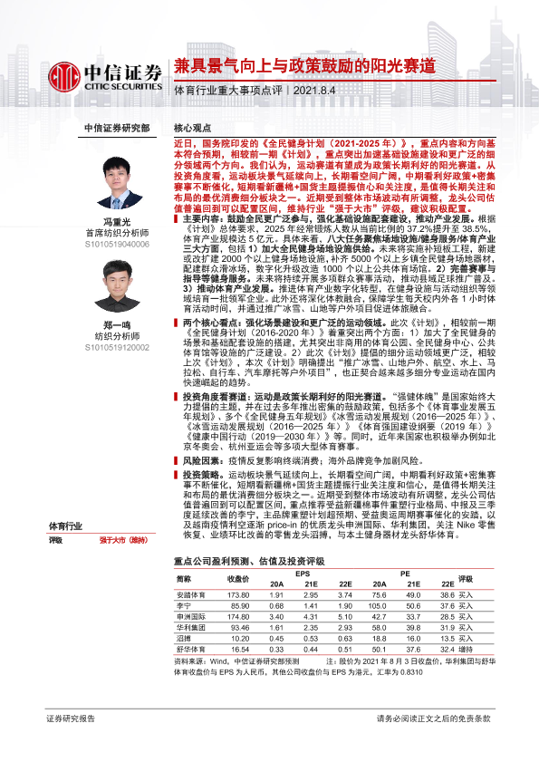 【中信证券】【20210804】20210804-中信证券-体育行业重大事项点评:兼具景气向上与政策鼓励的阳光赛道-3页