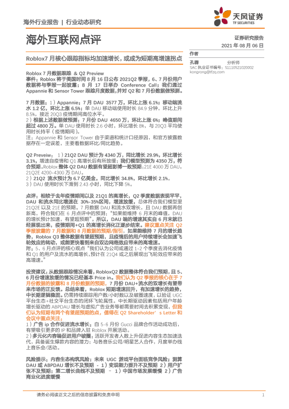 【天风证券】【20210806】海外互联网点评:Roblox7月核心跟踪指标均加速增长,或成为短期高增速拐点-7页