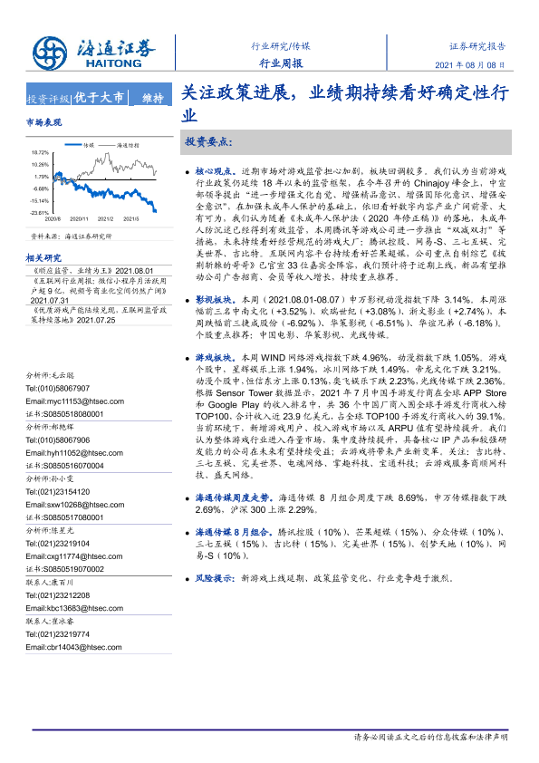 【海通证券】【20210808】20210808-海通证券-传媒行业周报:关注政策进展,业绩期持续看好确定性行业-11页