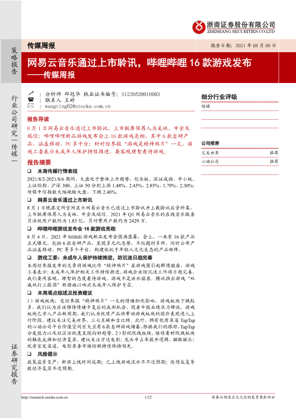 【浙商证券】【20210808】20210808-浙商证券-传媒周报:网易云音乐通过上市聆讯,哔哩哔哩16款游戏发布-22页