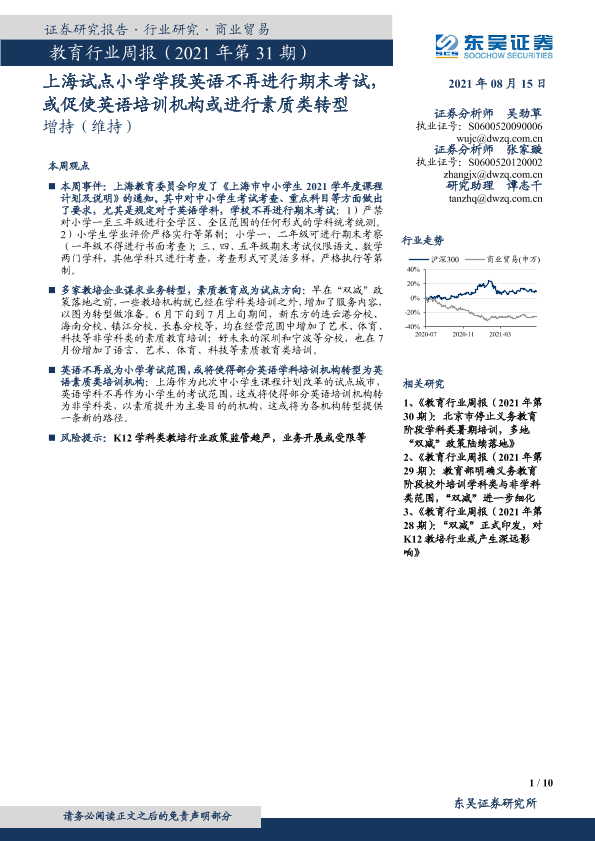 【东吴证券】【20210815】教育行业周报(2021年第31期):上海试点小学学段英语不再进行期末考试,或促使英语培训机构或进行素质类转型-10页