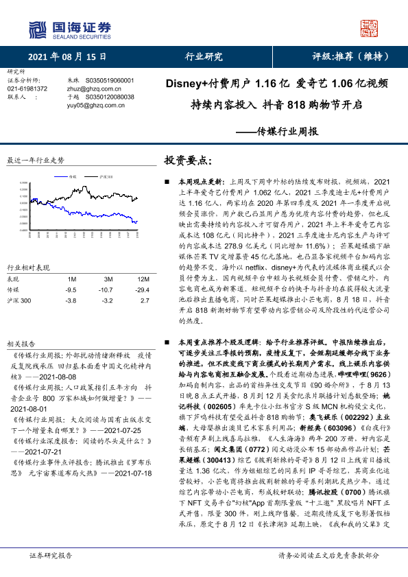 【国海证券】【20210815】20210815-国海证券-传媒行业周报:Disney+付费用户1.16亿爱奇艺1.06亿视频 持续内容投入抖音818购物节开启-19页
