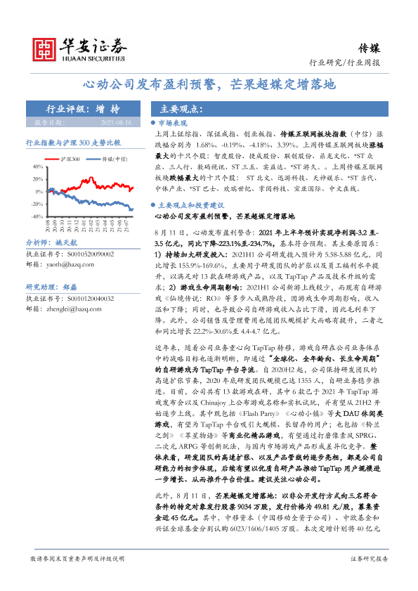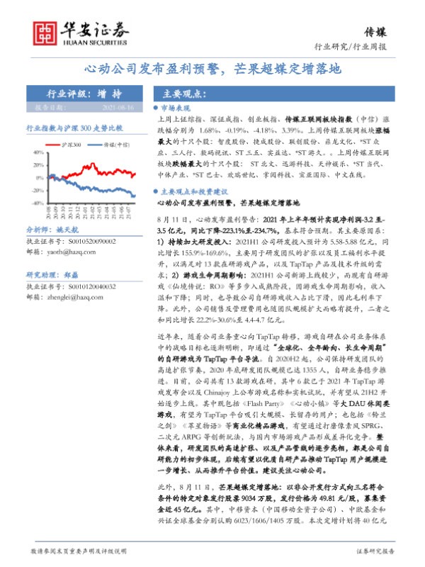 【华安证券】【20210816】20210816-华安证券-传媒行业周报:心动公司发布盈利预警,芒果超媒定增落地-17页