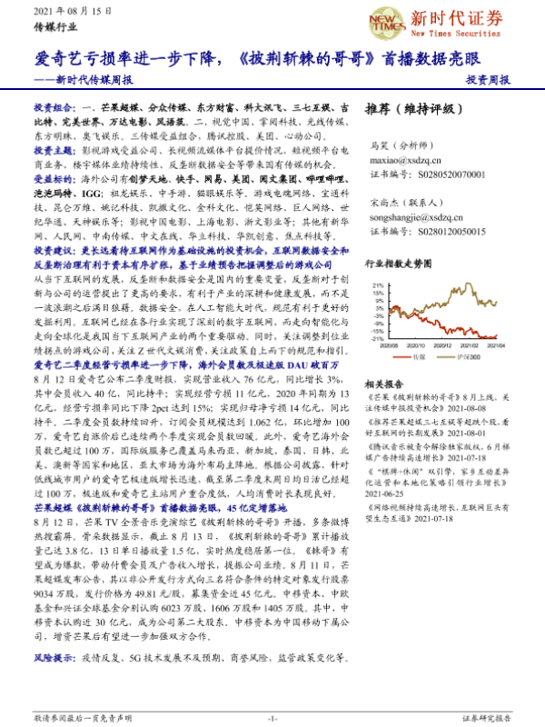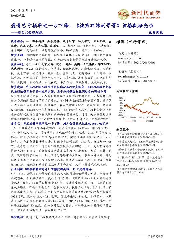 【新时代证券】【20210815】新时代证券-新时代传媒周报:爱奇艺亏损率进一步下降,《披荆斩棘的哥哥》首播数据亮眼-19页