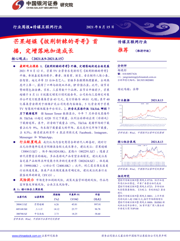 【银河证券】【20210815】20210815-中国银河-传媒互联网行业周报:芒果超媒《披荆斩棘的哥哥》首播,定增落地加速成长-36页