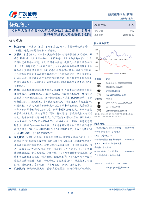 【广发证券】【20210822】20210822-广发证券-传媒行业投资策略周报:《中华人民共和国个人信息保护法》正式颁布;7月中国移动游戏收入同比增长6.62%-24页