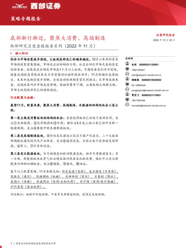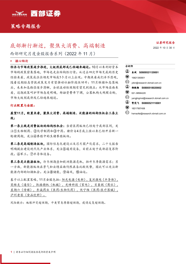 【西部证券】【20221030】西部研究月度金股报告系列(2022年11月):底部渐行渐近,聚焦大消费、高端制造-15页