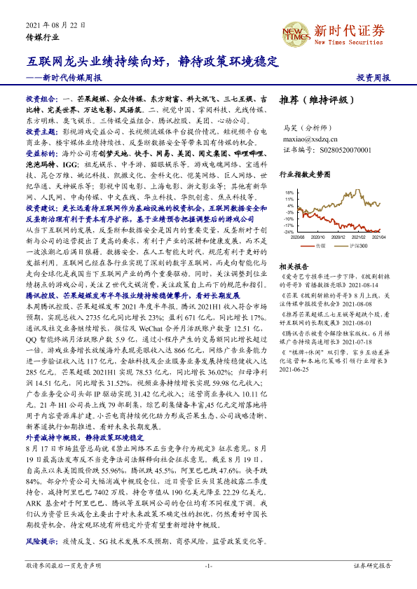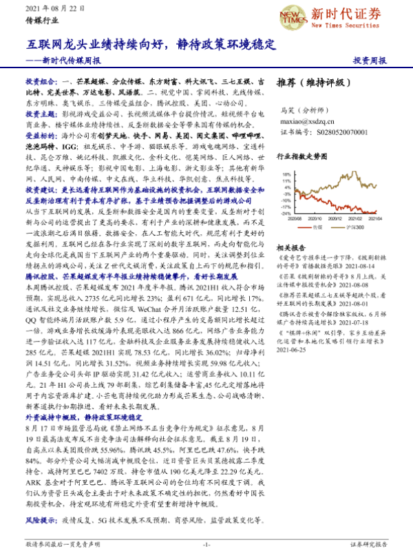 【新时代证券】【20210822】新时代证券-新时代传媒周报:互联网龙头业绩持续向好,静待政策环境稳定-20页