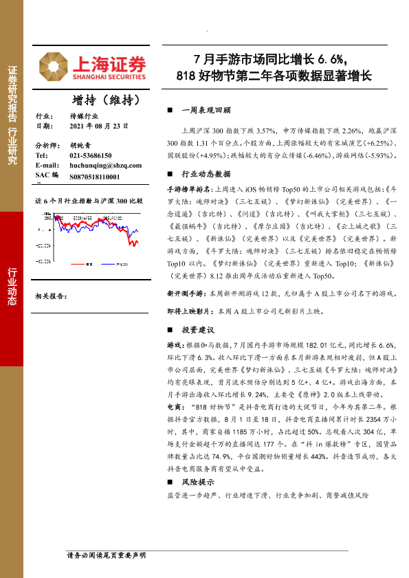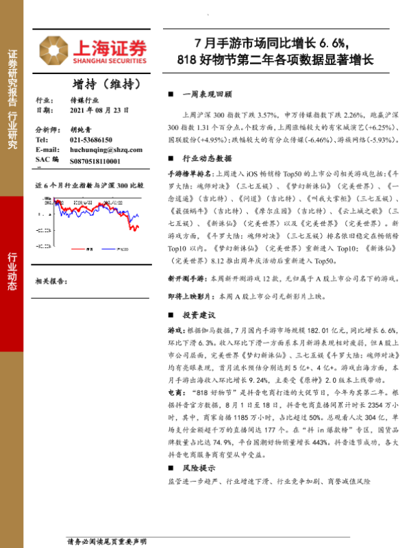 【上海证券】【20210823】7月手游市场同比增长6.6%,818好物节第二年各项数据显著增长-9页