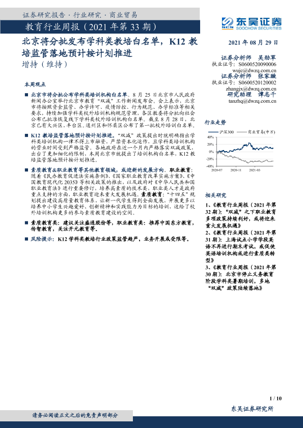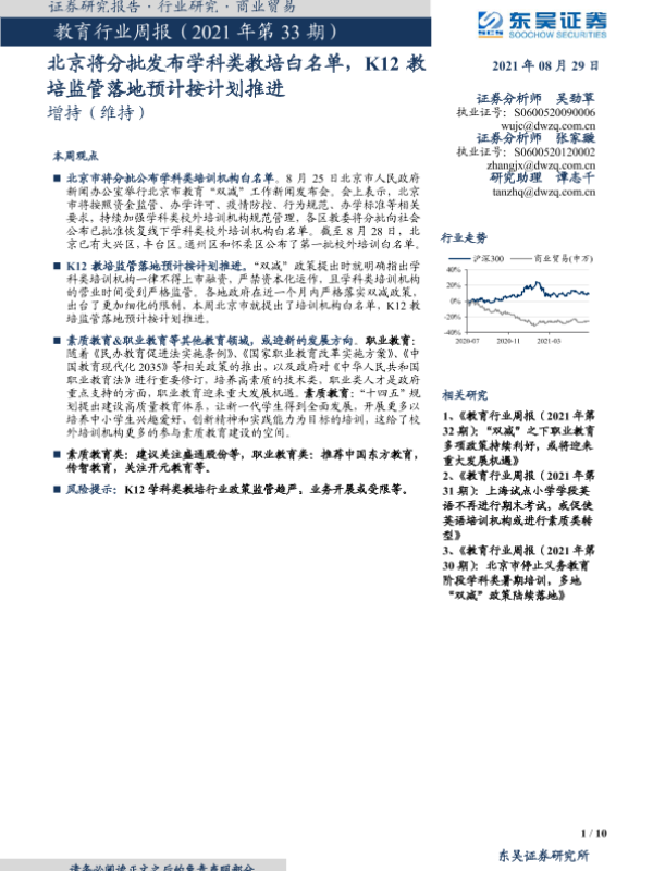 【东吴证券】【20210829】教育行业周报(2021年第33期):北京将分批发布学科类教培白名单,K12教培监管落地预计按计划推进-10页