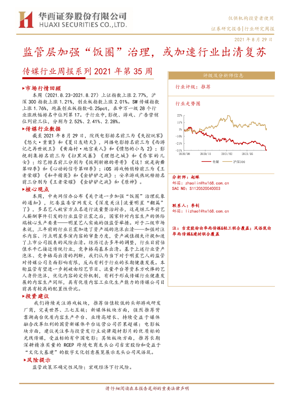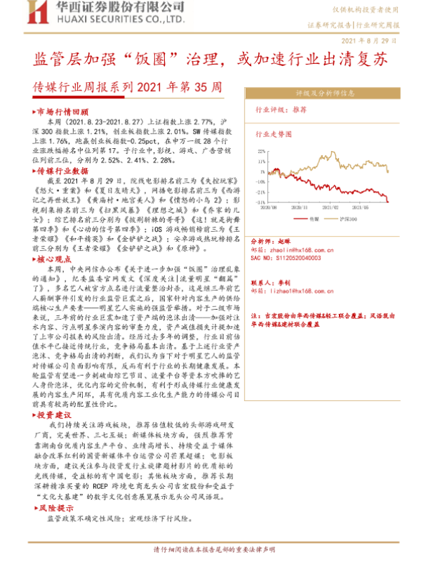 【华西证券】【20210829】20210829-华西证券-传媒行业周报系列2021年第35周:监管层加强“饭圈”治理,或加速行业出清复苏-15页