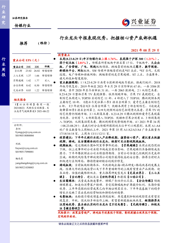 【兴业证券】【20210829】20210829-兴业证券-传媒行业周报:行业龙头中报表现优秀,把握核心资产底部机遇-17页