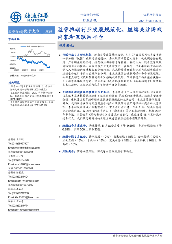 【海通证券】【20210829】20210829-海通证券-传媒行业月报:监管推动行业发展规范化,继续关注游戏内容和互联网平台-12页