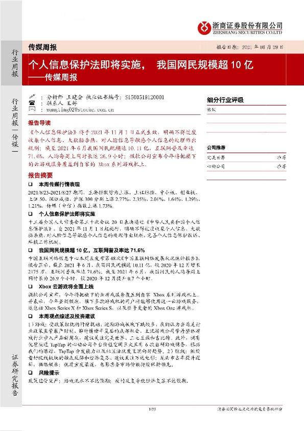 【浙商证券】【20210829】20210829-浙商证券-传媒周报:个人信息保护法即将实施,我国网民规模超10亿-23页