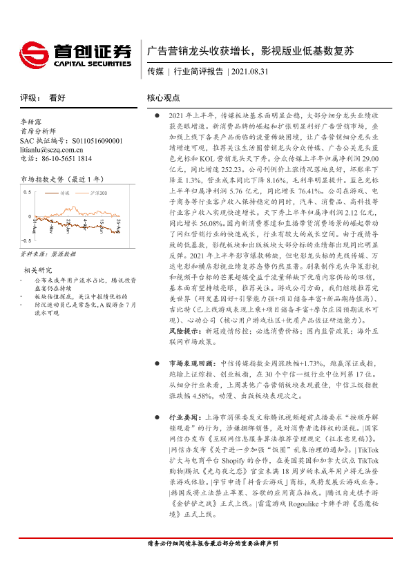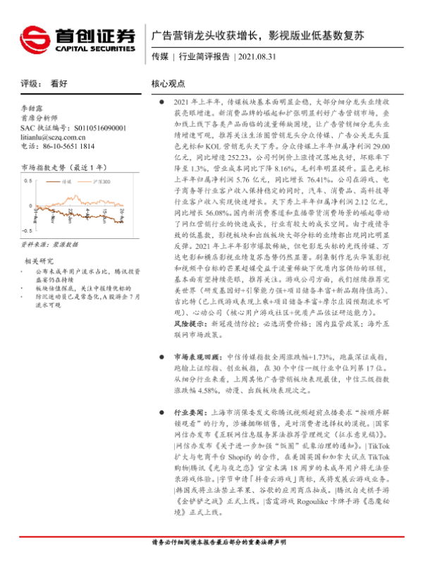 【首创证券】【20210831】广告营销龙头收获增长,影视版业低基数复苏-11页