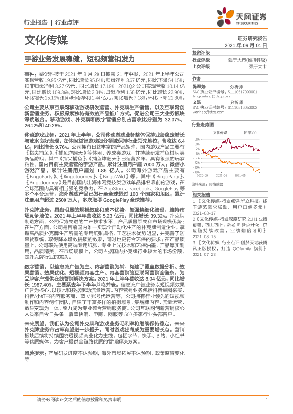 【天风证券】【20210901】20210901-天风证券-文化传媒行业点评:手游业务发展稳健,短视频营销发力-7页