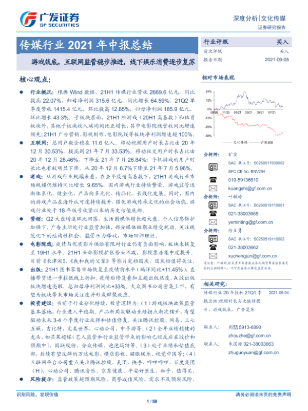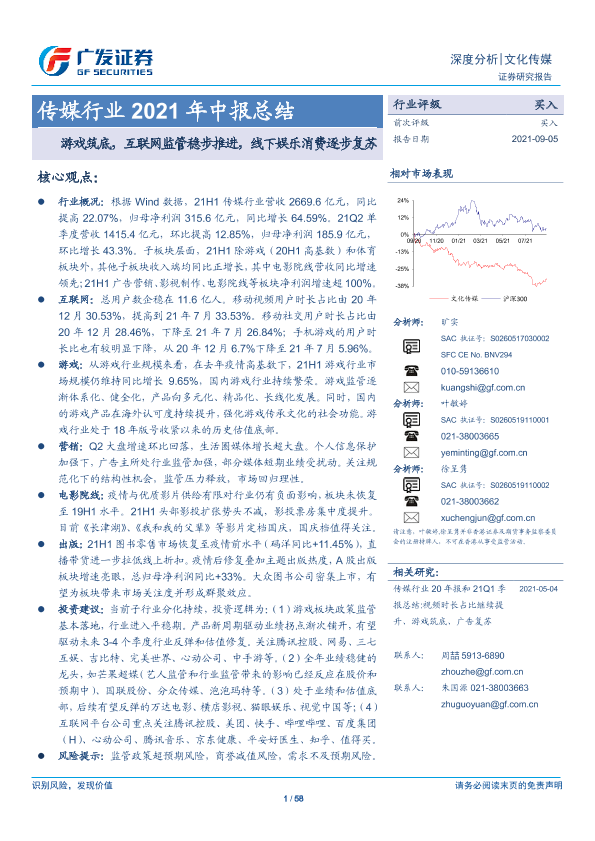 【广发证券】【20210905】传媒行业2021年中报总结:游戏筑底,互联网监管稳步推进,线下娱乐消费逐步复苏-58页