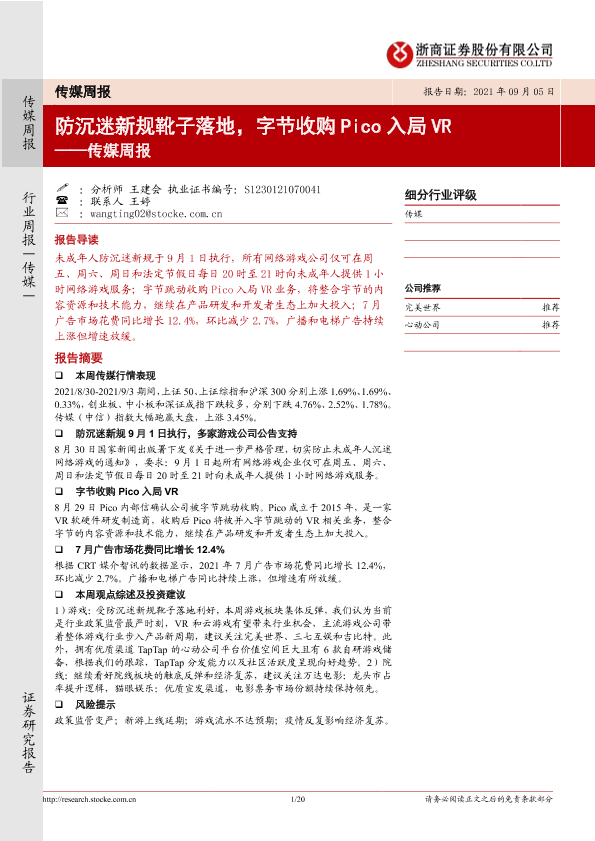 【浙商证券】【20210905】20210905-浙商证券-传媒周报:防沉迷新规靴子落地,字节收购Pico入局VR-20页