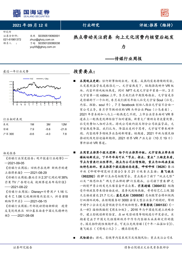 【国海证券】【20210912】传媒行业周报:热点带动关注前奏 向上文化消费内核望后起发力-19页
