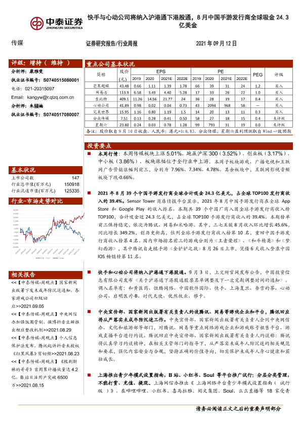 【中泰证券】【20210912】20210912-中泰证券-传媒行业周报:快手与心动公司将纳入沪港通下港股通,8月中国手游发行商全球吸金24.3亿美金-11页