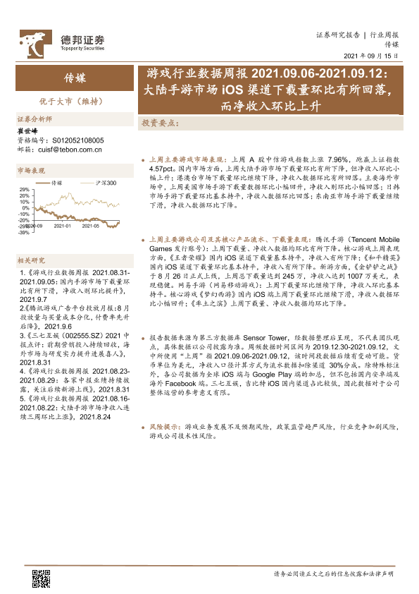 【德邦证券】【20210915】20210915-德邦证券-游戏行业数据周报:大陆手游市场iOS渠道下载量环比有所回落,而净收入环比上升-31页