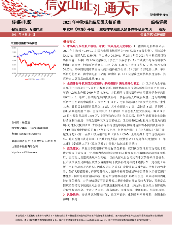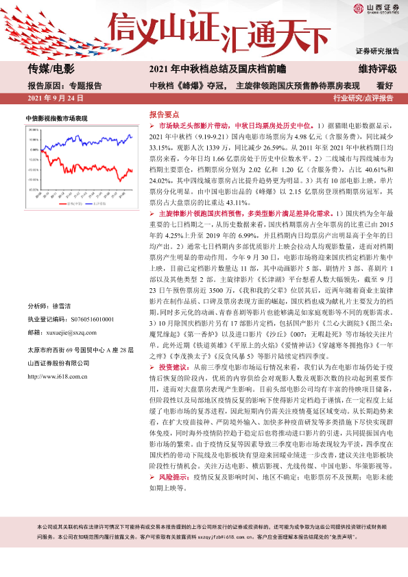 【山西证券】【20210924】2021年中秋档总结及国庆档前瞻:中秋档《峰爆》夺冠,主旋律领跑国庆预售静待票房表现-9页