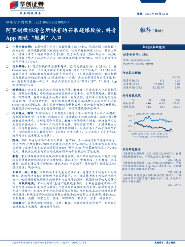 【华创证券】【20210926】20210926-华创证券-传媒行业周观察:阿里创投拟清仓所持有的芒果超媒股份,抖音App测试“短剧”入口-22页