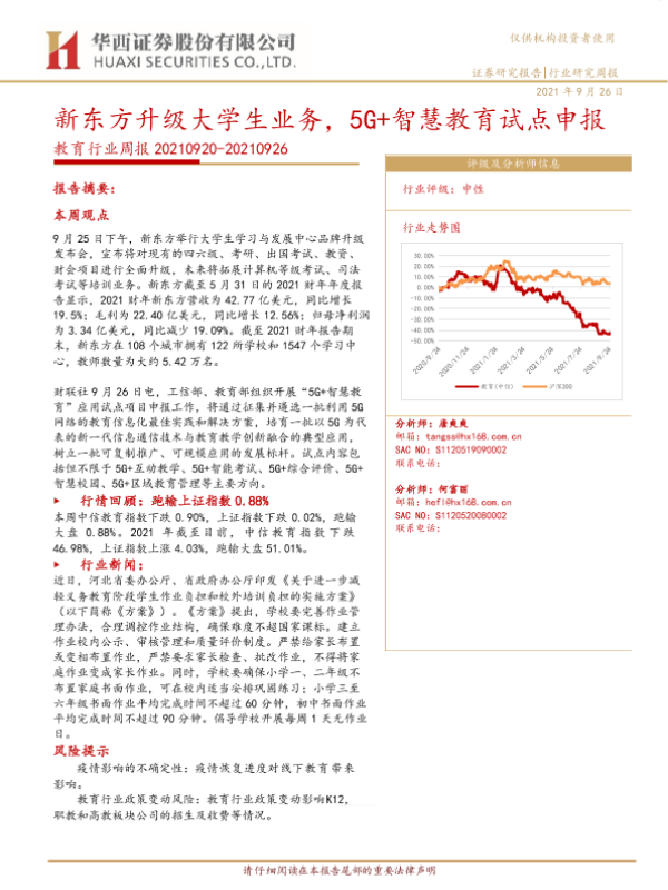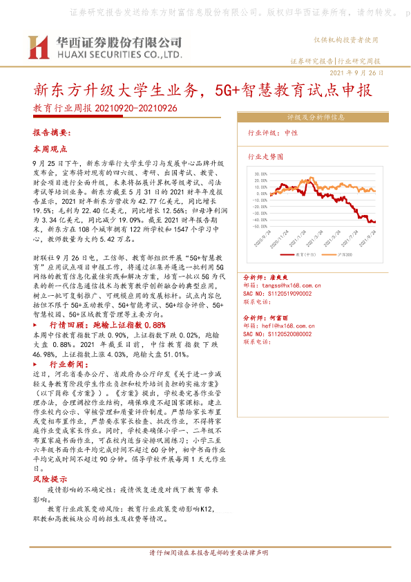 【华西证券】【20210926】20210926-华西证券-教育行业周报:新东方升级大学生业务,5G+智慧教育试点申报-21页