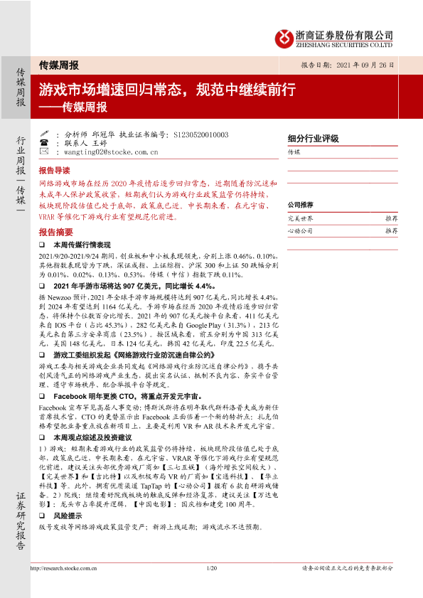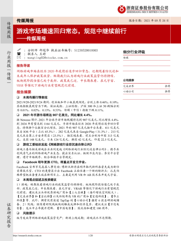 【浙商证券】【20210926】20210926-浙商证券-传媒周报:游戏市场增速回归常态,规范中继续前行-20页