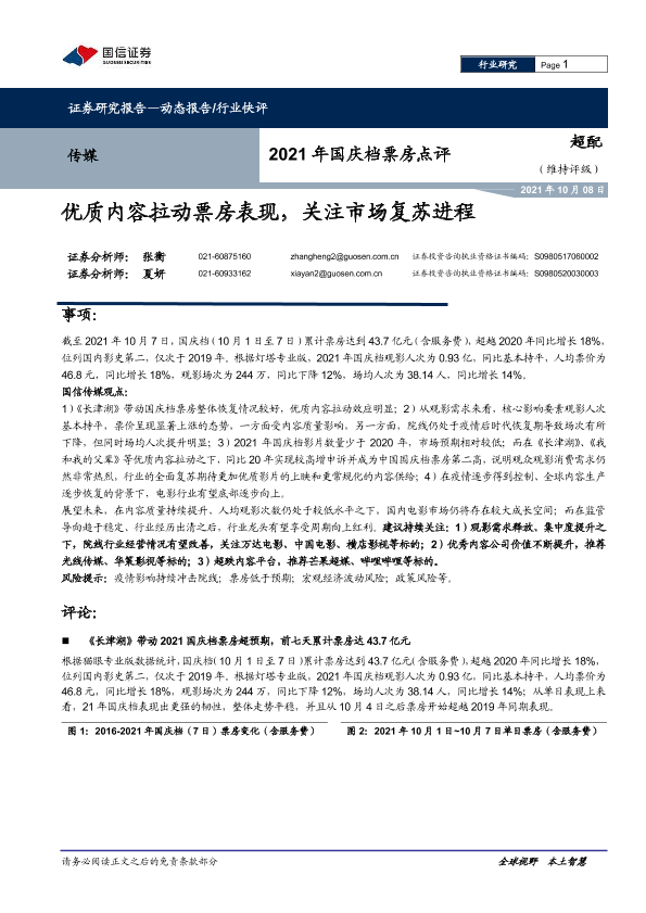 【国信证券】【20211008】2021年国庆档票房点评-优质内容拉动票房表现,关注市场复苏进程-6页