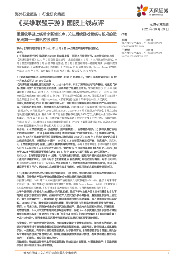 【天风证券】【20211009】20211009-天风证券-传媒行业:《英雄联盟手游》国服上线点评:腾讯控股跟踪:重量级手游上线带来新增长点,关注后续游戏管线与新规的适配周期-2页