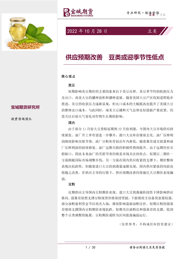 【宝城期货】【20221028】豆类月报:供应预期改善,豆类或迎季节性低点-20页