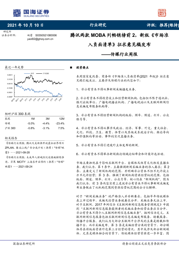 【国海证券】【20211010】20211010-国海证券-传媒行业周报:腾讯两款MOBA列畅销榜前2,新版《市场准入负面清单》征求意见稿发布-33页