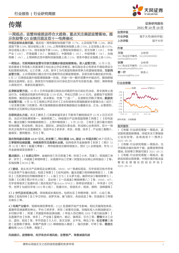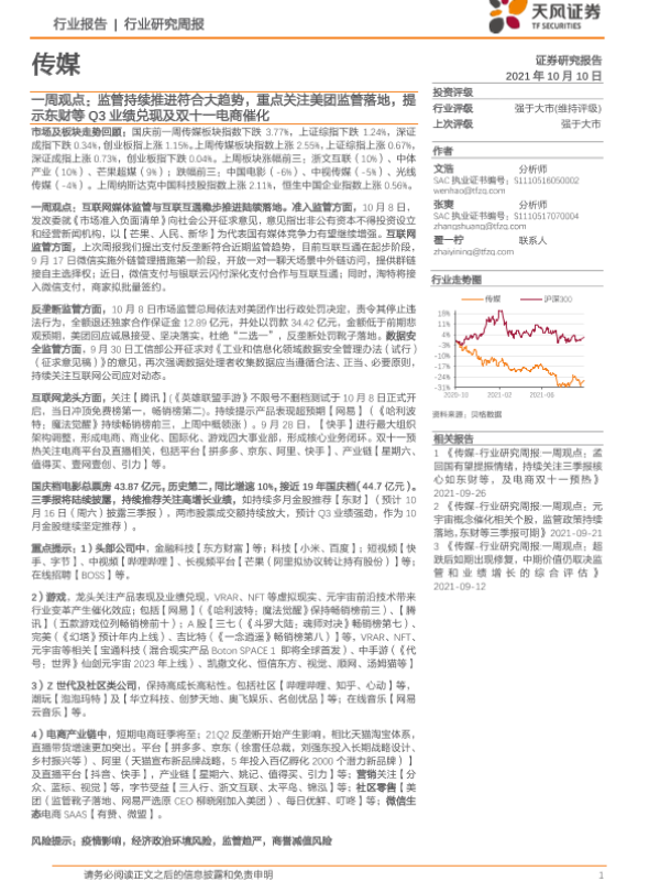 【天风证券】【20211010】20211010-天风证券-传媒一周观点:监管持续推进符合大趋势,重点关注美团监管落地,提示东财等Q3业绩兑现及双十一电商催化-18页
