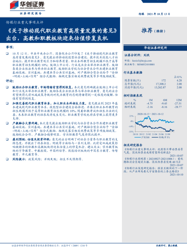 【华创证券】【20211013】20211013-华创证券-传媒行业重大事项点评:《关于推动现代职业教育高质量发展的意见》出台,高教和职教板块迎来估值修复良机-4页