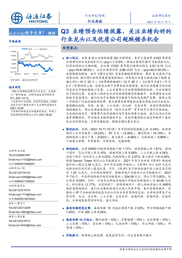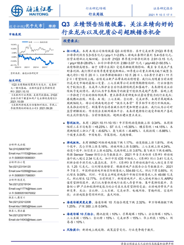 【海通证券】【20211017】20211017-海通证券-传媒行业周报:Q3业绩预告陆续披露,关注业绩向好的行业龙头以及优质公司超跌错杀机会-10页
