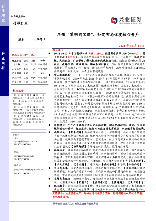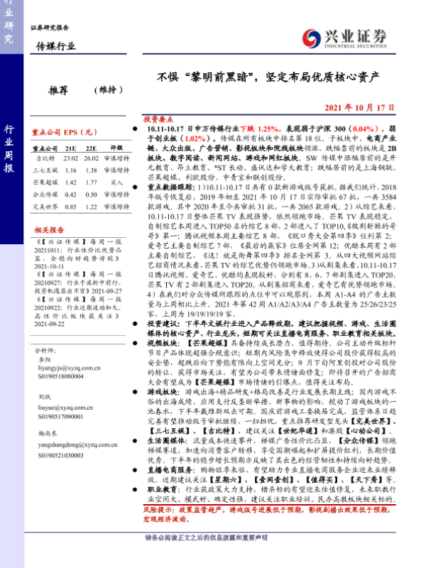 传媒行业 广告传媒 游戏板块 职业教育 视频平台